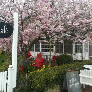 - Bei gutem Wetter können wir uns auch im Garten des Cafés ausbreiten.